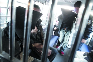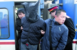 昨日上午,T232次列車進(jìn)站,旅客中有一群戴著手銬、蒙著頭套的特殊旅客,他們在民警看管下被押上警車。