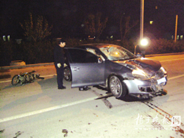 昨天凌晨,一輛大眾速騰轎車行駛到南京揚子江大道定淮門大街路口附近,突然將一名騎助力車的保安撞飛幾十米外,保安不治身亡,助力車被卡住拖行,轎車滑行幾十米后才停下,而開車男子自稱當(dāng)時時速為70公里左右。事發(fā)后,目擊者稱肇事司機兩次在路邊嘔吐,且聞到一股酒味,面對眾人詢問,肇事司機否認喝酒。然而昨天下午,記者獲悉,男子因交通肇事被刑事拘留,此外還涉嫌酒后駕駛。