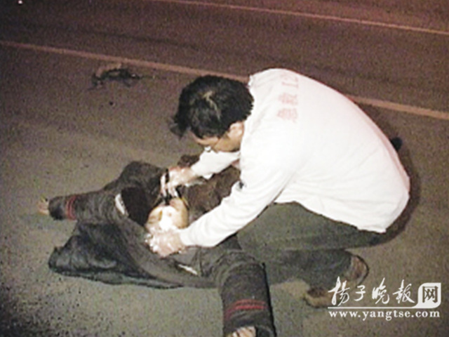 昨天凌晨0點35分,一輛由南向北行駛在南京揚子江大道上的銀灰色速騰轎車,在開到定淮門大街的路口時,突然將一名騎助力車身著保安制服的男子撞飛40多米外的車道上。頓時被撞保安不省人事。事情發(fā)生后,110民警接到報警立即通知了120救護車及交警五大隊到場處理。很快,民警臨時用路障將現(xiàn)場進行保護,此時,那名穿著保安制服的中年男子仰面倒在地上,這名保安是南京鼓樓區(qū)保安公司的保安萬德華。醫(yī)護人員將他抬上車就近送往南京醫(yī)科大學(xué)第二附屬醫(yī)院搶救。
