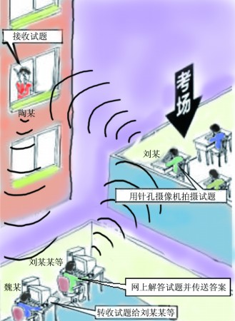 3月14日15時(shí)許,陶某將考生劉某利用作弊設(shè)備從考場(chǎng)內(nèi)傳輸出的試題找人作答,后由魏某通過(guò)作弊設(shè)備將試題答案發(fā)送給在考場(chǎng)里的劉某。3月14日下午考試結(jié)束后,陶某聯(lián)系宋某加入,幫助在次日的山東省公務(wù)員考試中作弊。