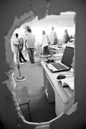 昨日上午,當(dāng)記者來到這家公司時(shí),只見兩間辦公室里的大部分辦公桌上已是空空蕩蕩,本該放著臺(tái)式電腦的地方,只剩下配套的鼠標(biāo)和鍵盤。而在兩間辦公室的墻上,分別留下了兩個(gè)形狀各異的洞。這兩個(gè)洞分別長不到1米,寬50公分左右,都又短又窄。公司的汪小姐稱,小偷肯定是從這里鉆進(jìn)辦公室,然后打開辦公室的門行竊的,因?yàn)檗k公室的門鎖并未損壞。
