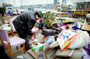 昨日上午9時許,百子灣家園東側(cè)空地上圍起警戒線。四五十名住戶不肯離去,身旁堆著鍋碗瓢盆、被褥、衣物等。“房子被拆了,晚上都不知住哪兒!币晃粙D女坐在自家被褥上哭了起來。她懷中3歲女孩穿著單薄毛衣,凍得直流鼻涕。