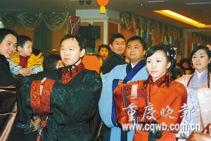 “重慶找不到,我們又到外地定制了這些陶器。”承辦該場婚禮的公司負責人宋先生介紹,新人的兩套衣服也是為他們量身定做,價格不菲。除此之外,司儀朗誦的文言文,也是鄭女士經(jīng)過研究,自己修改而成。 記者 朱雋 通訊員 李東 攝影報道