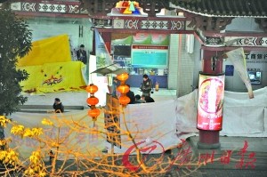 昨晚8時50分許,佛山市禪城區(qū)東方廣場德勝樓東南角前有近十輛警車?。在一樓某銀行營業(yè)廳門前的臺階上,一人多高的布將這里團團遮圍起來。