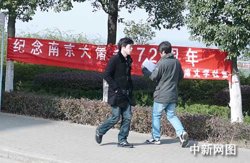 這條印有“紀(jì)念南京大屠殺72周年”字樣的條幅為一學(xué)生社團(tuán)所掛;顒(dòng)負(fù)責(zé)人李強(qiáng)說(shuō),在南京大屠殺72周年來(lái)臨之際他們開(kāi)展了簽名、圖片展、演講比賽等系列活動(dòng)。他說(shuō),用“紀(jì)念”這個(gè)詞很正常,沒(méi)有什么問(wèn)題。