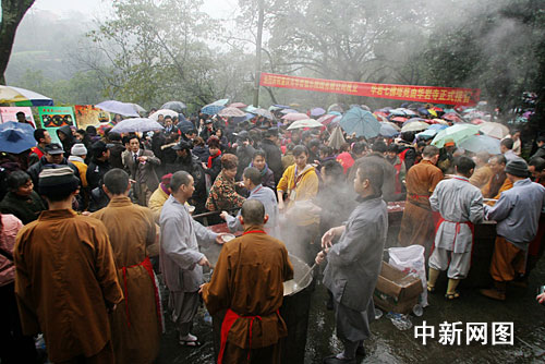 中新網(wǎng)重慶1月22日電 (孟幻)今天是中國(guó)農(nóng)歷臘月初八,天空雖然飄著小雨,有些許寒意,數(shù)萬(wàn)山城市民仍是涌入當(dāng)?shù)厝A巖寺喝臘八粥,過臘八節(jié),期望來年增福增壽。