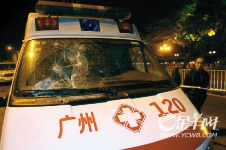 記者接報趕到現(xiàn)場,在沿江西路中山大學附屬第二醫(yī)院大門前,一輛車身噴有“廣州紫荊醫(yī)院”字樣的救護車停在路邊,車頭的擋風玻璃和右前門玻璃被砸爛,地上還留有砸車用的磚塊。紫荊醫(yī)院司機李先生雖然沒有被打傷,但是情緒還很激動。他告訴記者,他們接到電話稱,有病人需要救護車轉(zhuǎn)送茂名,救護車在中山二院門口剛停下來,“前后各一臺越野車便把救護車夾住,車上沖下來十多人,有人手上還拿著砍刀!