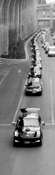 中午12點,這個婚車隊又出現(xiàn)在了穿金路上。一輛凱迪拉克越野車排在車隊最前方,負(fù)責(zé)開道和攝像。新郎、新娘乘坐的加長林肯緊隨其后,7輛奔馳S350和1輛奔馳320行駛在車隊靠前方陣,7輛寶馬X5和3輛凱迪拉克位于車隊中間,3輛保時捷卡宴押后。這些車輛除兩輛為重慶牌照、一輛為廣州牌照外,其余車輛均掛著昆明本地車輛號牌。車內(nèi)的人不時搖下車窗,幾乎所有車輛上的司機(jī)和乘客都是年輕人,其中不乏剃著光頭的時尚潮人。