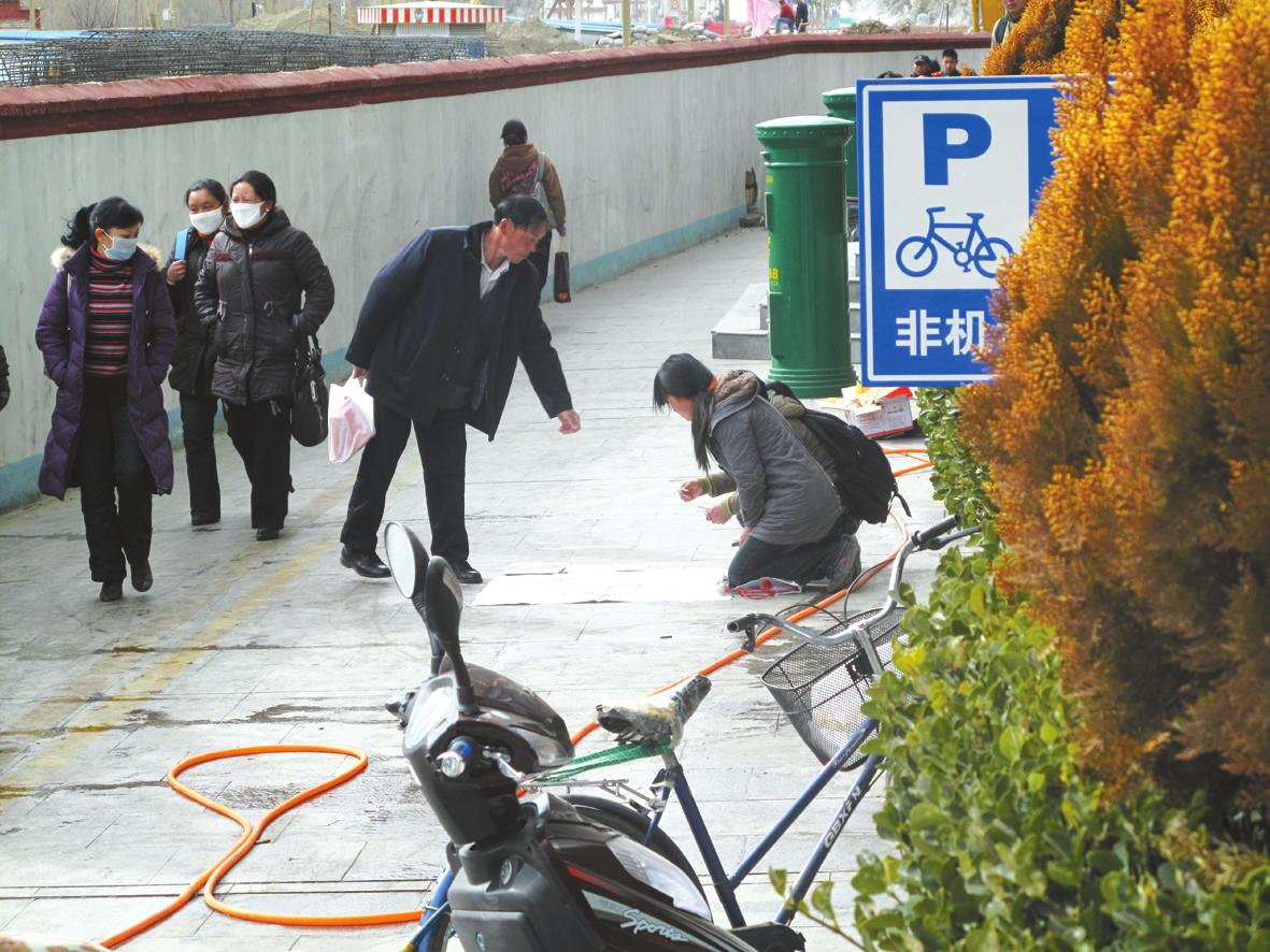 25日下午17時許,兩個15歲左右的女孩跪在北京中路郵電局前面的人行道上,以為母治病為名向來往路人乞討。附近一些商戶以及行人紛紛慷慨解囊,伸出援助之手。(王景蓮)