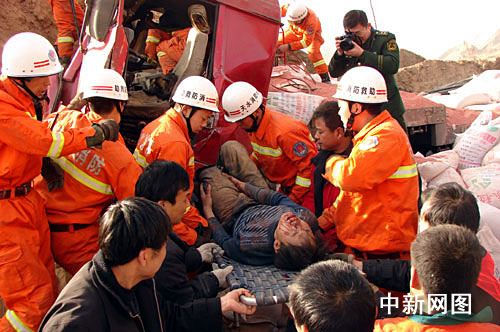 當(dāng)日14時(shí)30分,一輛由青海格爾木駛往陜西省西安市車號為陜籍半掛車,載著15噸鉀肥行至甘肅境內(nèi)天巉公路65公里+50米處,因剎車失靈導(dǎo)致車輛失控直接沖斷公路防護(hù)欄撞在土山坡上,駕駛室嚴(yán)重受損,兩名司乘人員重傷被困。