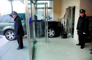 昨日下午4時許,京版信息港寫字樓前,一輛路虎越野車騎在大樓入口處,車身只有擦痕,四周散落著鋁合金框架和玻璃碎片,寫字樓大門已經(jīng)被撞碎了一半。