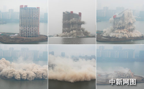 中新網(wǎng)南昌2月6日電(何柳斌)“轟、轟、轟”伴隨三聲巨響,22層高的五湖大酒店瞬間倒地,距離爆破點(diǎn)200米處觀(guān)測(cè)點(diǎn)如同三級(jí)地震,感覺(jué)有輕微震感。