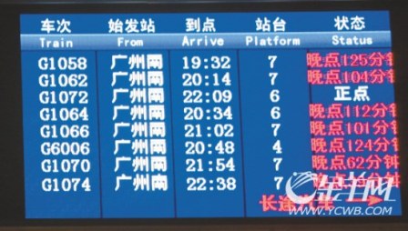 到晚上6時(shí)30分,現(xiàn)場(chǎng)LED顯示屏顯示,從原定下午5時(shí)06分發(fā)出的9個(gè)班次列車都處于晚點(diǎn)狀態(tài)中,車站所有站臺(tái)上都沒有列車?,數(shù)千旅客因此滯留廣州南站內(nèi)。