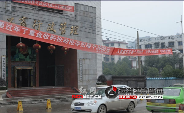 2月7日下午,記者聯(lián)系了張家界南莊坪辦事處,分管政法工作的張副主任和一位彭姓工作人員介紹,標(biāo)語確實是他們掛的,“我們區(qū)里面(永定區(qū)政法委)對抓獲兩搶一盜的都有獎勵,抓獲一個分別為5000元和1000元,而辦事處為了更大程度上獎勵見義勇為者,分別在相應(yīng)基礎(chǔ)上增加獎勵3000元和1000元,前段時間有人抓獲兩個搶劫犯的,都有兌現(xiàn)了,在開始‘冬季嚴(yán)打’活動以來就掛出這個標(biāo)語了!”