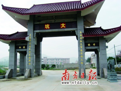 大坑村是一個(gè)偏遠(yuǎn)的革命老區(qū)村。從鎮(zhèn)場(chǎng)輾轉(zhuǎn)乘車幾公里,遠(yuǎn)遠(yuǎn)可見青瓦大理石牌坊高聳于村口,上面紙貼的“大坑”二字顯得粗糙而扎眼。
