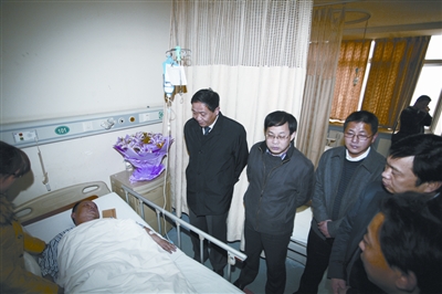 大年初二,在連續(xù)工作近一個(gè)月后,37歲的江漢區(qū)城管執(zhí)法大隊(duì)直屬六中隊(duì)隊(duì)員劉漢橋突發(fā)腦溢血。昨日(21日)下午,江漢區(qū)委書記張平、區(qū)長(zhǎng)李強(qiáng)來(lái)到協(xié)和醫(yī)院,看望了劉漢橋及妻子,并送去鮮花、慰問(wèn)金和營(yíng)養(yǎng)品。