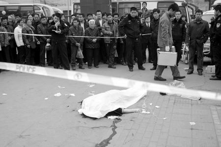 昨日11時(shí)40分許,鄭州市客運(yùn)南站門(mén)前。一身穿黑色棉襖、灰色短褲的年輕女子,躺在地上,臉上、脖子處遍布血跡。一旁,救護(hù)人員正對(duì)其救治,近百名市民議論紛紛。
