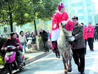 新郎周先生和新娘肖小姐都是80后人,對(duì)于中國(guó)古典文化頗為癡迷。在勾勒自己的婚禮時(shí),在國(guó)外留學(xué)多年的肖小姐希望能像中國(guó)古典小說中描述的一樣,新郎騎馬前導(dǎo),新娘花轎及嫁妝后隨,鑼鼓鞭炮迎至男家。