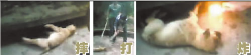 視頻不長,但實在令人揪心。被虐小狗是一條黃色小狗,從視頻一開始到結束都在承受地獄般的摧殘:身著橫條紋上衣的男生提著小狗用力摔下約2米高的階梯!八罌]?”“沒有,還在出氣!薄肮。打死,打死來吃。”小狗慘叫了兩聲,躺在地上不能動彈,從拉近的視頻鏡頭可以看到,它在急促地呼吸!坝没鹋谡ㄋ!”畫面外,一個男生的聲音尖叫道。緊接著,“橫條紋”將幾個鞭炮塞進小狗嘴里,用打火機點燃后跑開!鞍、叭、叭”三聲清脆的鞭炮相繼響起,視頻中同時傳出了幾個男生瘋狂的笑聲。
