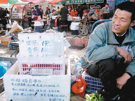余東陽(yáng)說,自己老家在河南,今年30歲,曾到廣東打工,去年來寶雞做賣菜的小生意。父母年紀(jì)大了,一直盼著他趕快結(jié)婚,但他在寶雞沒有親友,沒人給他介紹,每天做生意又沒時(shí)間結(jié)識(shí)異性朋友,于是他就有了邊賣菜邊征婚的想法!笆袌(chǎng)里人流量大,而且來買菜的中老年人多,他們和我父母一樣,能理解我的心情,用這種方式征婚,知道的人多又不耽誤生意,說不定就碰上好的了。”小余說,每天都有很多人問他征婚的事,但還沒有人正式給他介紹。