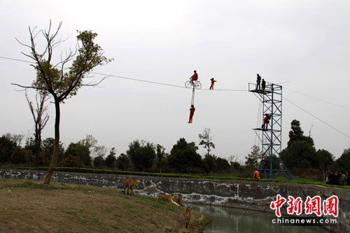 “小燕子”迅速調(diào)整姿勢、繼續(xù)前進,剛剛十步開外,最驚險的一幕出現(xiàn)了,園中的老虎似受到現(xiàn)場緊張氣氛的影響,突然顯得有些躁動不安,在鋼絲繩下來回走動,并警覺的看著上方的挑戰(zhàn)者“小燕子”,驚天動地般地呼嘯了兩聲后,成年公虎“阿彪”向著“小燕子”所在的上方跳去,差點碰到位于鋼絲下方領(lǐng)路的自行車扶梯上。同時,一只母虎試圖爬到附近的大樹上!靶⊙嘧印币欢认萑肓死匣⒂|爪可及的危險境地,實在是讓現(xiàn)場觀眾為她捏了一把冷汗。鋼絲上,命懸一線的“小燕子”,在空中搖晃了幾下,停下來凝神吸氣,盡力控制住鋼絲不再晃動,一步一步向鋼絲另一端走去。終于,“小燕子”耗時近20分鐘,成功的完成挑戰(zhàn),一舉突破50米,創(chuàng)造了自己新的紀錄,爾后空手走到自行車前“凱旋”,觀眾忍不住拍手叫絕。