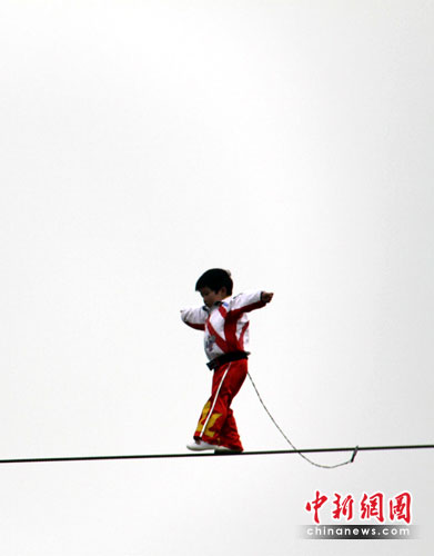 中新網(wǎng)常州3月30日電(記者 唐娟)30日,年僅3歲半的江西女童“小燕子”(藝名,原名張小燕),在江蘇常州淹城野生動物世界上演了一出老虎頭上空手走鋼絲的驚險絕技。在成功走了50米鋼絲后,“小燕子”所在的江西神童藝術(shù)團張團長宣布,三日后,“小燕子”將向百米發(fā)起挑戰(zhàn),刷新紀錄,并申報“虎口空手走鋼絲”吉尼斯世界紀錄;同時,“小燕子”將在常州淹城野生動物世界設(shè)下一個月的擂臺,歡迎國內(nèi)外各界人士前來挑戰(zhàn),勝者當場懸賞100萬元。