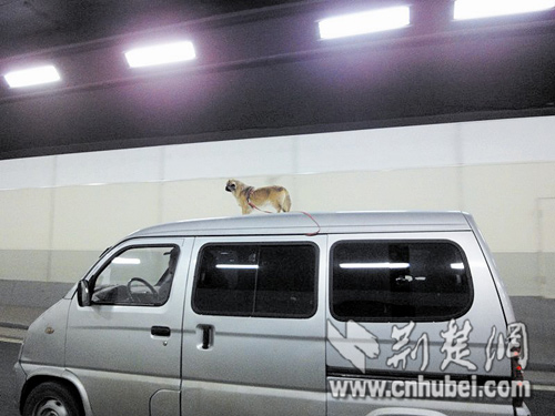 在一輛快速行駛的面包車的頂上,站著一只小狗。昨日,一組標題為“武漢長江隧道內虐狗門事”的照片出現(xiàn)在網上。