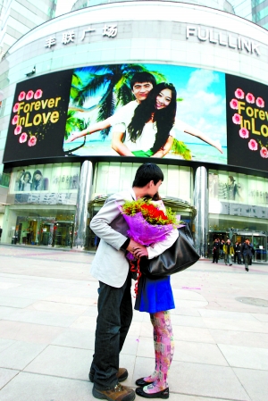 昨天傍晚,22歲的北京女孩婷婷和男友約好了在豐聯(lián)廣場(chǎng)的大屏幕下見面,當(dāng)她剛在大屏幕下停下腳的一剎那,大屏幕上竟傳出了男友叫她的聲音,隨即就是一大段愛情告白和浪漫求婚,婷婷抬頭望著大屏幕,大屏幕上傳出來的是《今天你要嫁給我》的浪漫音樂,畫面上卻是她和男友的一張張?zhí)鹈劭s影,還有正在向自己求婚的男友,真真切切,一時(shí)間她愣住了神。2分55秒過后,這段求婚視頻播放完畢,男友從豐聯(lián)廣場(chǎng)里小心翼翼地走了出來,期待著婷婷的點(diǎn)頭答應(yīng)。婷婷這才相信,這真的是男友向她的求婚,她拭去晶瑩的淚花,奔向男友的懷抱,緊緊相擁。這一瞬間感動(dòng)了圍觀的群眾,大家熱烈鼓掌,祝福這對(duì)帥哥美女終成眷屬。