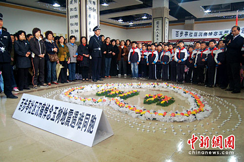 上午10時,數(shù)百名武漢百步亭居民、育才小學學生代表有序來到社區(qū)活動中心。在工作人員的引導下,他們靜靜地圍繞著用鮮花扎成的“4.14之心”分排站好,手捧蠟燭,向遇難同胞默哀。活動現(xiàn)場,居民自發(fā)手折紙鶴,以此寄托對災(zāi)區(qū)民眾的牽掛與祝愿。