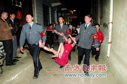 “我那天去晚了,本來是在這個城中村拍其他的,聽到爆料說有人跳樓就趕了過去!睍r任昆明《都市時報》攝影記者的黃興能對南都記者說,“我趕到的時候人已經(jīng)被消防救了下來,然后就把人交給了聯(lián)防隊員,但她還在不停掙扎,這時候,照片中左邊第一個聯(lián)防只好抬起女子的右腳往前走,我恰好捕捉到了這個瞬間。在拉的過程中,這名女子一直強烈反抗。最后把她抬進了治安崗?fù)ぁ!?/p>