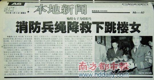 2004年3月13日,昆明李家堆221號,26歲的李某站在窗臺上,準(zhǔn)備第二次自殺。據(jù)稱因為丈夫與其他女人有染,她去年曾經(jīng)跳過一次樓,沒有死成,此時腿上還有傷。這次,她被迅速趕來的民警勸說緩了一緩。消防員從樓上繩降而下,成功把她給救了下來。