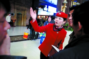 昨日,北京站,換上新裝的女客運(yùn)員在為旅客指路。當(dāng)日,北京站和北京南站的女客運(yùn)員,全部換上了“空姐式”新裝,讓很多乘客眼前一亮。北京站有關(guān)人士表示,此前女客運(yùn)員為深藍(lán)色大蓋帽套裝,此次統(tǒng)一換為紅色掐腰上衣、黑色長(zhǎng)褲、紅禮帽、彩色絲巾。而更換新裝,主要是改變乘客對(duì)客運(yùn)員嚴(yán)肅的老印象,服裝的暖色調(diào),也可拉近乘客與客運(yùn)員的距離。在更換新裝的同時(shí),火車站也將提升服務(wù)水平,為旅客提供“空乘式” 服務(wù)。本報(bào)記者 王嘉寧 劉澤寧 實(shí)習(xí)生 周琦 攝影報(bào)道