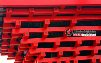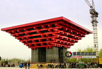 帖子描述說,這座紅色的建筑高24米,四方形的平臺(tái)邊長50米。上部是四方冠形結(jié)構(gòu),外頂部邊長43米,其6層架空層全部為鋼架結(jié)構(gòu);下面還有四個(gè)鋼筋混凝土大立柱。整個(gè)建筑在結(jié)構(gòu)、色調(diào)和外形等方面都和世博會(huì)中國館相似。