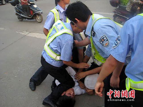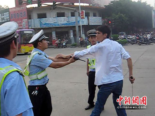 該司機(jī)在返回現(xiàn)場(chǎng)接受處理時(shí)直接質(zhì)問民警:“現(xiàn)在已經(jīng)是傍晚6點(diǎn)30分了,我的車為什么還不能過?”情緒異常激動(dòng)的他跟本聽不進(jìn)執(zhí)勤民警的任何解釋和勸導(dǎo)。隨后,該司機(jī)回到貨車駕駛室內(nèi)拿來一把長(zhǎng)約一米的大砍刀,徑直來到中山崗紅綠燈路口就想沖上前欲砍民警。