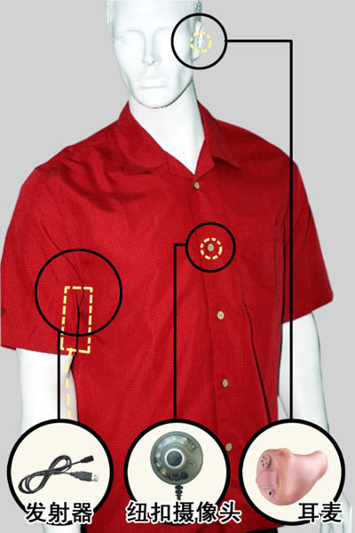 作弊考生進(jìn)考場(chǎng)前,要帶上電子遙控設(shè)備、米粒耳麥,穿上安裝有針孔攝像頭的衣服。