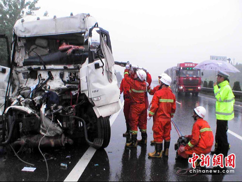 到達(dá)現(xiàn)場(chǎng)后,只見地上滿是兩車撞擊后散落的碎片,一輛車牌號(hào)為陜AA5477的貨車車尾已變形,車牌號(hào)為贛AA1398的追尾石油貨車車頭嚴(yán)重變形,車內(nèi)司機(jī)雙腿被方向盤卡住無法動(dòng)彈,且受傷嚴(yán)重,生命垂危。另有一名婦女被困在后排座位,由于事發(fā)時(shí)婦女正平躺在后座睡覺,所以只被前排座位擠壓,尚有活動(dòng)空間,并無危險(xiǎn)。