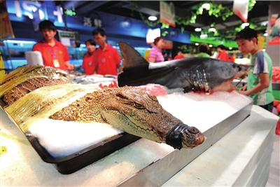 昨天,記者提出看超市出售鱷魚(yú)的相關(guān)證明,永輝超市的前臺(tái)負(fù)責(zé)人劉先生稱,超市從農(nóng)貿(mào)市場(chǎng)購(gòu)進(jìn)了鱷魚(yú)和鯊魚(yú),對(duì)方都提供了檢疫報(bào)告和許可證,“賣(mài)方提供相關(guān)證明,我們就能進(jìn)貨公開(kāi)銷(xiāo)售,超市不需要提供證明”。 (記者王奕)