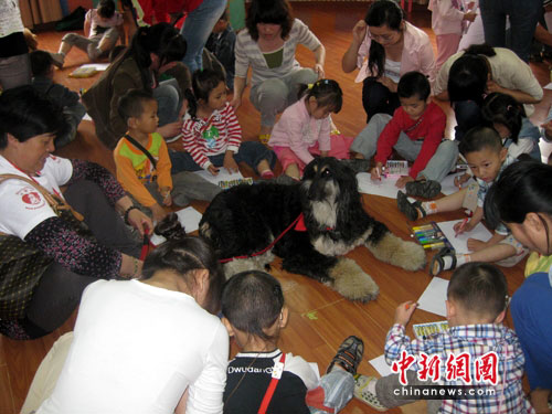 狗狗們不僅表演了才藝,還當(dāng)起了狗模特。小朋友們用手中的畫(huà)筆描繪出心中狗醫(yī)生的模樣?粗⒆觽兣d奮的樣子,四川聾兒康復(fù)中心的老師十分感慨:“這些孩子因?yàn)槁?tīng)力有一些障礙,平日顯得很內(nèi)向和自閉。而這些狗狗出現(xiàn)時(shí),孩子的天性立刻顯現(xiàn)了出來(lái),他們用含糊不清的聲音叫狗狗的名字,看著老師的口型努力去發(fā)出那些音節(jié),表現(xiàn)出了對(duì)狗狗的極大熱情。我們非常喜愛(ài)并期待狗醫(yī)生的到來(lái)!