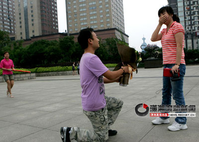 “胡安萱,我好愛好愛你!”70米長的大紅橫幅從象征“幸!钡哪μ燧喩洗瓜,長沙小伙王樂手捧玫瑰單膝下跪向女友求婚:“老婆,嫁給我吧,我們生個(gè)兒子讓他早點(diǎn)過兒童節(jié)!”