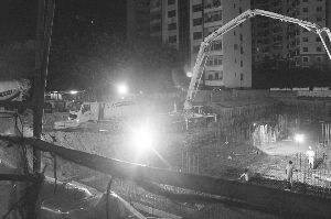 當(dāng)天凌晨1時許,記者來到該施工工地上,該工地開著明亮的燈光,挖出了三四米深的地基,一輛混凝土攪拌車發(fā)出“哐哐”的響聲,數(shù)十名工人正在地基上鏟水泥。凌晨1時20分許,市城管支隊特勤大隊的執(zhí)法人員趕赴現(xiàn)場,要求施工方立即停工。“我們和這些混凝土公司預(yù)約好了,一停工會損失很多錢!笔┕し揭幻(fù)責(zé)人與執(zhí)法人員求情。執(zhí)法人員告知,目前屬于中考高考階段,決不允許建筑工地超時施工影響學(xué)生和周邊居民休息。執(zhí)法人員當(dāng)場責(zé)令正在趕工的混凝土攪拌車退出施工地點。