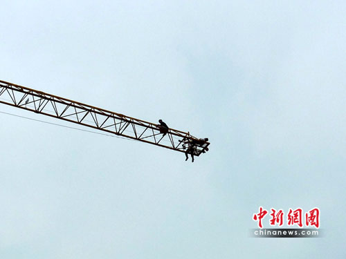 中新網(wǎng)柳州6月3日電(羅海生 黃坤軍)6月3日,廣西柳州市東環(huán)路一在建工地35米高的塔吊頂端,三名農(nóng)民工為了討薪欲跳塔。接警后柳州特勤消防大隊(duì)迅速出動(dòng)一臺(tái)多功能救援車(chē)、1臺(tái)53米云梯車(chē),9名官兵趕赴現(xiàn)場(chǎng)救援,經(jīng)過(guò)近一個(gè)小時(shí)的勸說(shuō)三民男子才放棄了輕生的念頭。