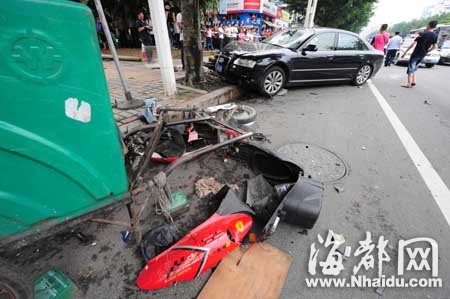 目擊者鄭小姐說,當(dāng)時(shí)她騎著電動(dòng)車,在豪華轎車后面,與其同向行駛。豪華轎車先刮碰到一名騎自行車的女子,接著,非機(jī)動(dòng)車道上一名騎摩托的男子和一名騎電動(dòng)車的男子被撞飛,高度超越小車車頂,又重重摔到了人行道上。附近商家則說,豪華車是為躲避騎自行車的女子,打方向盤向右避讓,隨即撞上兩名騎車的男子!叭绻麤]這棵樹就慘了,可能更多人被撞!备呦壬男≤嚠(dāng)時(shí)就停在事發(fā)地附近等朋友。他說,他先是聽到一聲刺耳的剎車聲音,循聲看去,看到兩名騎車男子被撞飛。另有目擊者說,豪華車撞人后繼續(xù)往前沖,撞倒路邊的電話亭,再撞上行道樹后才停下。受傷的三人中,一人昏迷不醒,滿身是血。豪華車司機(jī)沒有受傷。