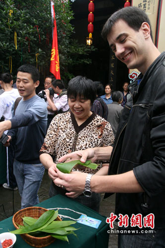 現(xiàn)場(chǎng)學(xué)習(xí)包粽子熱情最高的當(dāng)屬來自英國(guó)、意大利、泰國(guó)等20多個(gè)國(guó)家的海外留學(xué)生。盡管有師傅現(xiàn)場(chǎng)示范,可是留學(xué)生們包出的粽子極具個(gè)人風(fēng)格,大大小小形態(tài)各異,有的是平的,有的一個(gè)“角”也沒有,有的粽子還沒等學(xué)生松手,米粒已經(jīng)從粽葉里散落出來,現(xiàn)場(chǎng)一片歡笑。