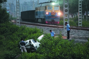 昨日(13日)下午,京承鐵路線順義區(qū)李天路鐵道口,一輛本田轎車闖過道桿,與一列貨運列車尾部相撞。轎車內(nèi)母子被救出,此時一列客運列車開來,轎車又被撞出數(shù)十米遠(yuǎn)并跌落在路旁溝內(nèi)。
