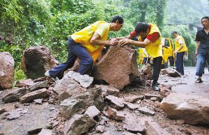 記者看到,垮塌的邊坡高約30米,寬約4米,滾落的巖石雖然被清理走了一部分,但仍可看到最大的也有1平方米。“我們看到的最大的石頭約有1噸重,大小約2平方米!背滔壬f,“滾落的石頭大約有15噸的樣子。”