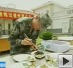 【解說(shuō)】在觀眾的熱情邀請(qǐng)下,曹師傅又表演了一個(gè)他的拿手絕技,在氣球上切肉絲。氣球下面放著三根鋼針,肉放在氣球的上面,用刀切成粗細(xì)均勻的肉絲而氣球卻沒有破。讓市民真正感受到了大師的風(fēng)采。
