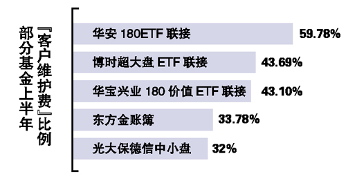 具體來看,18家已公布半年報的基金管理公司,上半年平均向渠道支出了13.76%的管理費(fèi)用于“客戶維護(hù)”。其中,支出“客戶維護(hù)費(fèi)”占其管理費(fèi)收入最高的三家公司,分別為長信基金、東方基金、光大保德信基金,三家公司各自支出了自身管理費(fèi)的23.61%、22.25%、20.98%用于“客戶維護(hù)”。而從單個基金出發(fā),這個數(shù)據(jù)則更為驚人。整體來說,業(yè)內(nèi)最高三至五成的費(fèi)用支出比例仍然讓人咋舌。