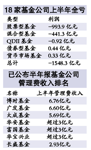 18家基金公司旗下234只基金的半年報面世,基金業(yè)利益鏈昭然若揭:今年上半年,已披露半年報的基金共計(jì)虧掉基民1548億元,但基金公司管理費(fèi)收入不減反增,半年大賺51.13億元, 比去年同期多收了16.01%;基金銷售渠道更是坐收漁利,上述基金上半年共計(jì)支出客戶管理費(fèi)高達(dá)7.04億元,同比增長了13.28%。