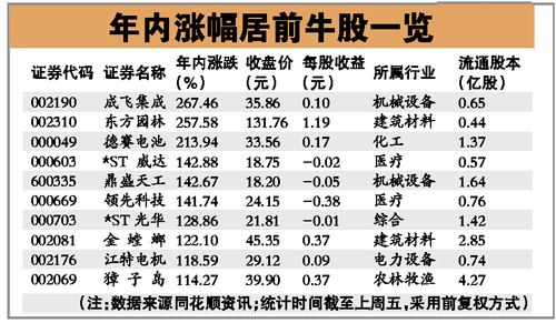 流通盤(pán)股本不大,是年內(nèi)牛股的又一大特點(diǎn)。前20名牛股中,中小板股票有8家,占四成。而流通股本超過(guò)2億股的只有7家;流通股本在2億股以下的有13家(含2億股),占全部20家公司的65%,其中,漲幅居前的幾只牛股中,有三只流通盤(pán)在7000萬(wàn)股以下。大牛股東方園林(002310)是一只流通盤(pán)才2175萬(wàn)股的袖珍小盤(pán)股(送股前),成飛集成總股本不過(guò)是2.06億股,流通股本6504萬(wàn)股,是典型的“大行業(yè)、小公司”。(李成 )