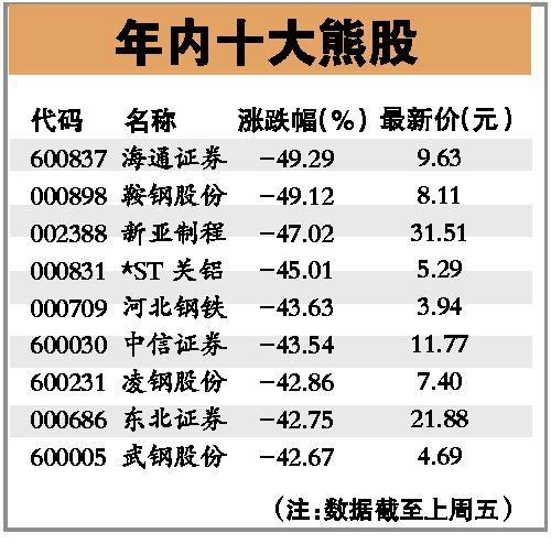 盡管截至上周五,大盤(pán)年內(nèi)跌666.40點(diǎn),跌幅高達(dá)20.33%,不過(guò),許多股票卻創(chuàng)出歷史新高。本報(bào)統(tǒng)計(jì)發(fā)現(xiàn),截至上周五,兩市A股中,有100多只股票年內(nèi)漲幅超過(guò)50%,20只股票年內(nèi)漲幅超過(guò)100%,三只股票年內(nèi)漲幅更是高達(dá)200%以上(含200%)。